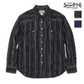 SUGAR CANE(シュガーケーン)のウエスタンシャツ。"経糸、緯糸ともに20番手で織り上げたドビーストライプ生地のウエスタンシャツ。ネイビ一は濃中淡のインディゴでグラデーションを表現し、コントラストを出すためにクロス柄をイメージして織り上げたドビーが特徴的。ブラックは硫化染めをベースにしたブラックに対して3色のグレーでグラデーションを表現。レッドを入れることでコントラストを強調した。型は1950~60年代のヴィンテージがベースの「Lot No. SC29180」を採用しており、それぞれ経年変化にも期待できる。"(シュガーケーン公式サイトより)
