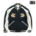 テーラー東洋のスーベニアジャケット、通称スカジャン。 最もスタンダードな両面にアセテート生地を使ったリバーシブルタイプ。 中綿がないため季節を問わず着用でき、独特なドレープ感も魅力。"表面はブラック×オフホワイトのモノトーン調のボディに、月夜に咆哮する虎を配した「THE スカジャン」といえる王道の絵柄。1950年代中期の作品をもとに刺繍の針足を駆使して虎の毛並みや筋骨隆々とした体躯を写実的に表現しており、黒いサテン生地に際立つコントラストの強い配色で、迫り来るような迫力を持った躍動感あふれる仕上がりとなっている。背中のJAPANの文字はヴィンテージでも人気の高いオリエンタルなフォントを再現。